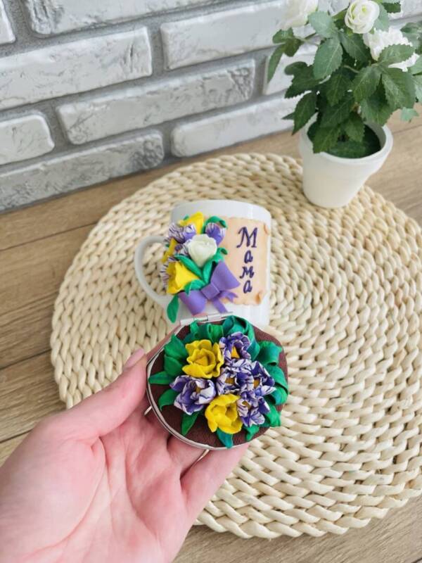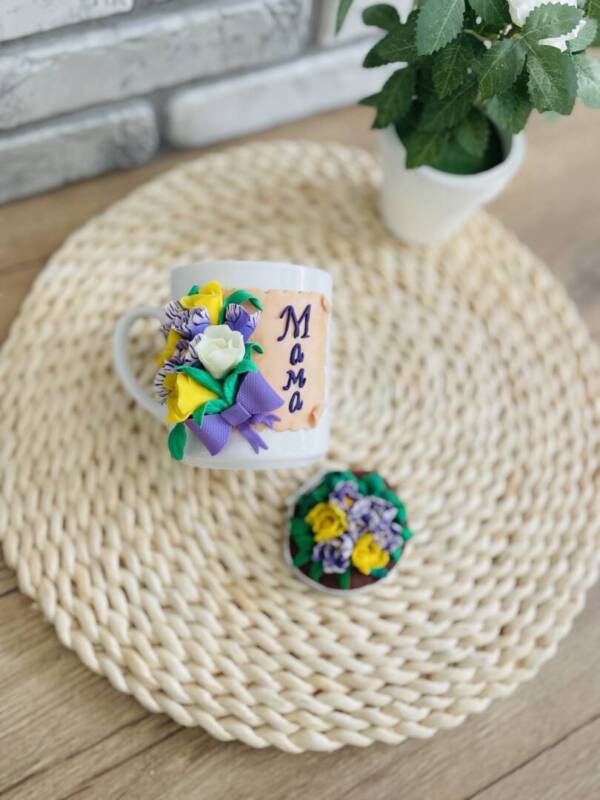 Декорирана чаша “Минзухари с послание” в комплект с огледалце със същата декорация.